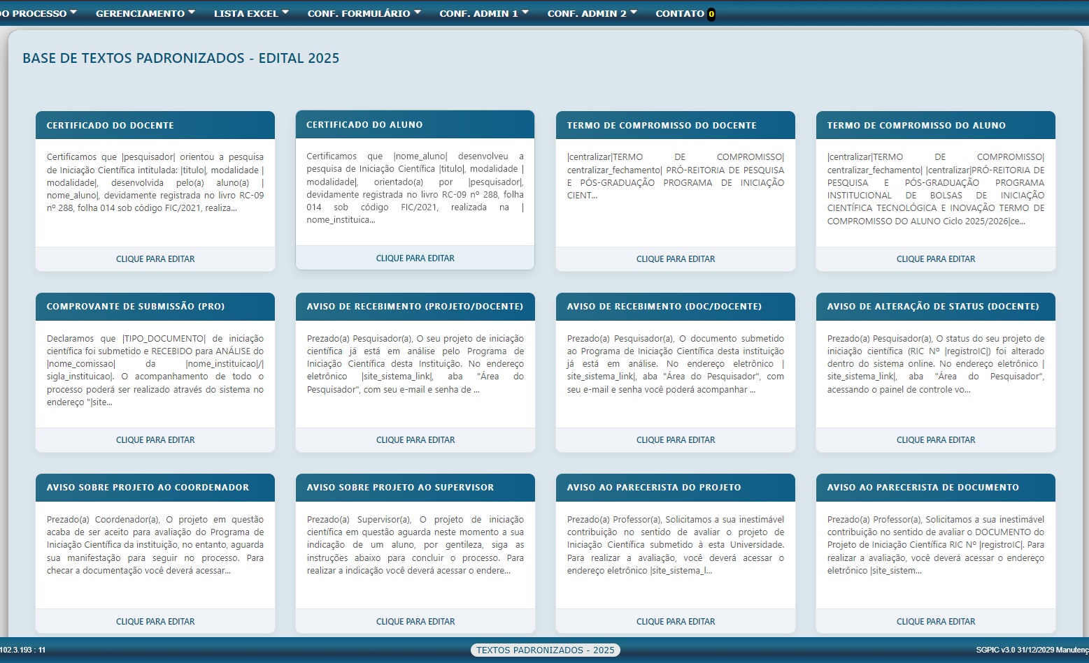 A tela de documentos obrigatórios foi totalmente reformulada. O administrador quem determina exatamente quais arquivos serão exigidos no momento da submissão para cada modalidade (PIBIC, PIBITI, etc.) de acordo com a fase do processo.