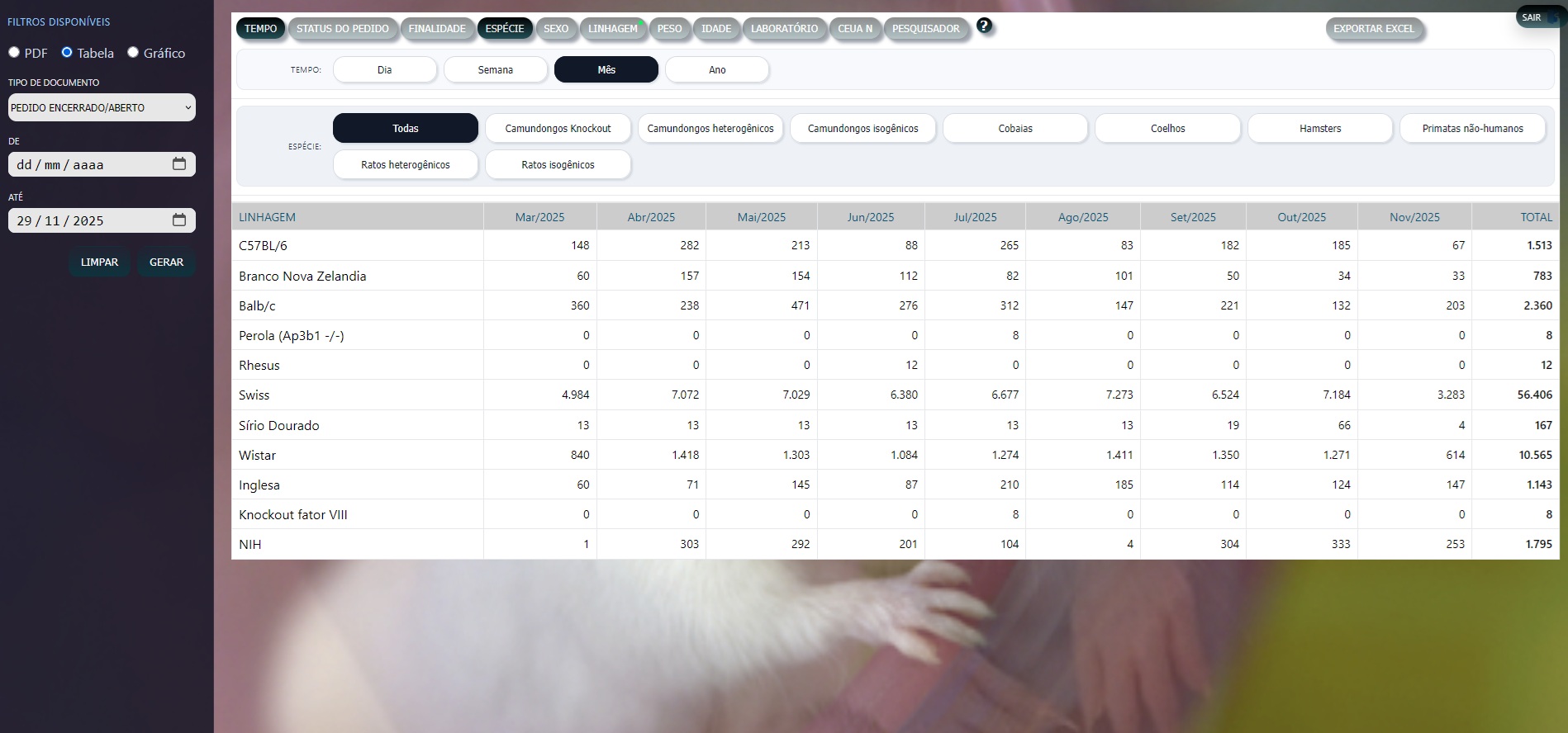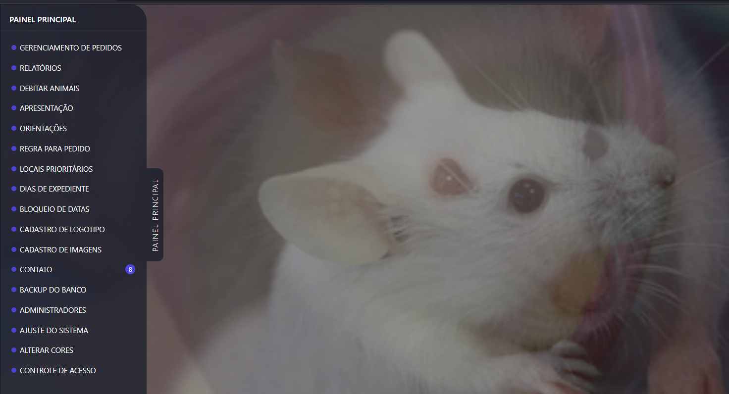 O painel de controle do pesquisador foi aprimorado para trazer um ambiente mais limpo, distribuído e intuitivo. O mesmo se aplicou para a tela de pedido de animais, lembrando que o biotério pode bloquear datas ou dias em que não há entrega de animais, como sábado, domingo, feriado, etc.
