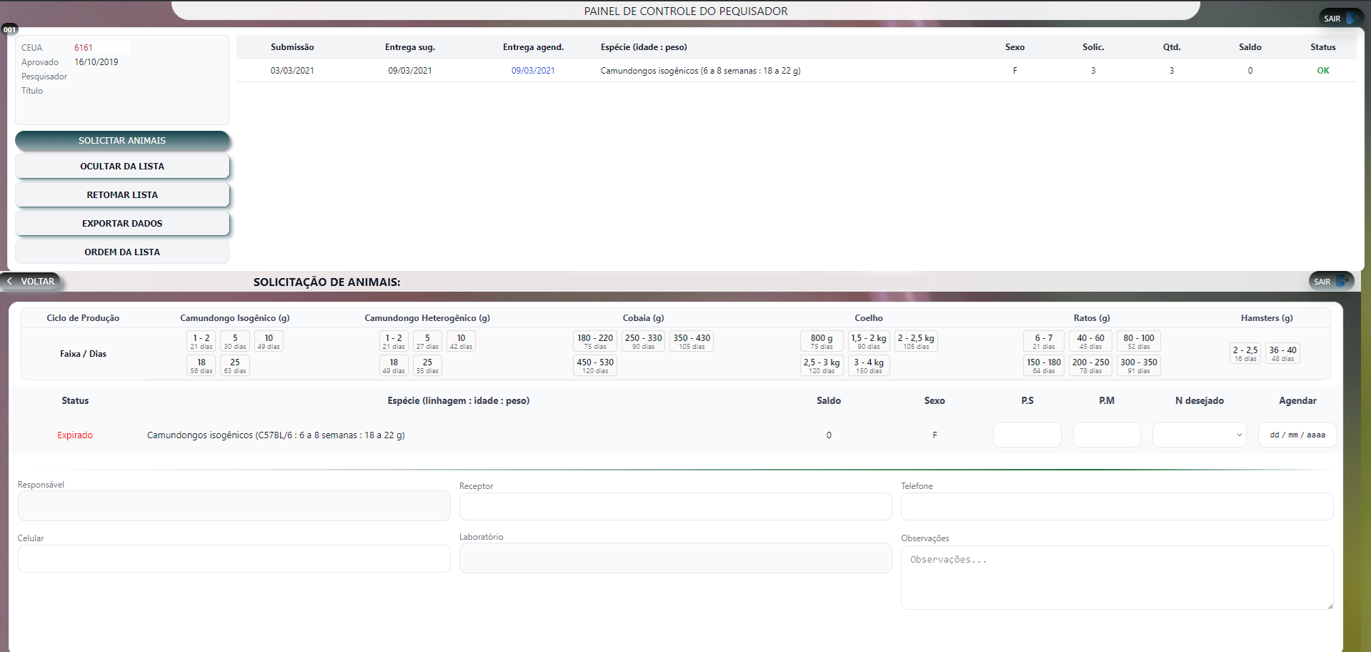 O painel de controle do pesquisador foi aprimorado para trazer um ambiente mais limpo, distribuído e intuitivo. O mesmo se aplicou para a tela de pedido de animais, lembrando que o biotério pode bloquear datas ou dias em que não há entrega de animais, como sábado, domingo, feriado, etc.